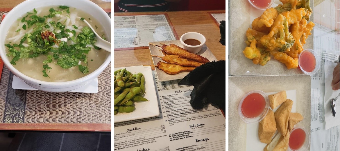 Rice noodles in red curry broth with peanuts and eggs, topped with sliced cabbage, carrot, cilantro, and green onion. Choice of chicken or beef.